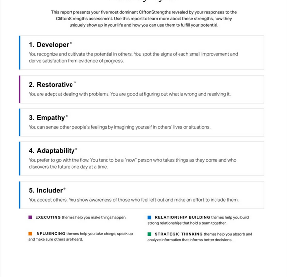 Before we could get started on the conference, we had some homework to do! We were asked to complete the CliftonStrengths assessment and report back with our top five strengths. Each strength was assigned a color; we didn’t know what the colors meant, but we would be learning later during the meeting. The assessment asked us about our opinions, views, and reactions to a wide variety of things. It really forced us to think more about the types of leaders and people we were.