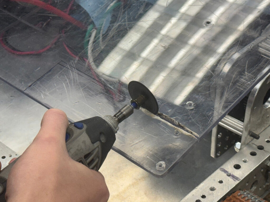 Having your robot’s battery not blow up is fun. Using the combination of a Dremel and a metal file, we created the perfect nest for our battery. We hope it likes this spot, because it isn’t going anywhere else. There’s still some work to be done to refine this battery-cocoon, but it’s a good start.