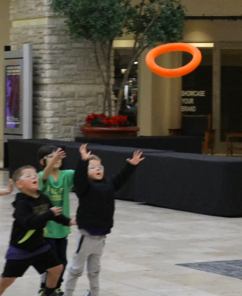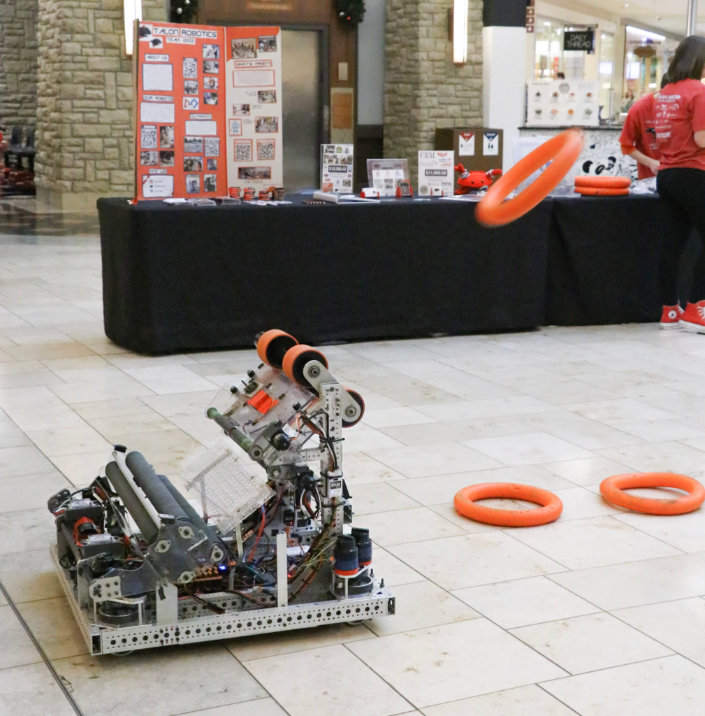 We wanted people to be able to interact with our robot at this event, which meant Cronus was back! While Cronus is an older bot, from the game CRESCENDO, it is still a great demo bot! Cronus shoots “notes,” which are large, foam rings perfect for catching. We did have a bit of fixing up to do before the event, but thanks to the hard work of our build team, we were able to showcase our bot to its full ability.
